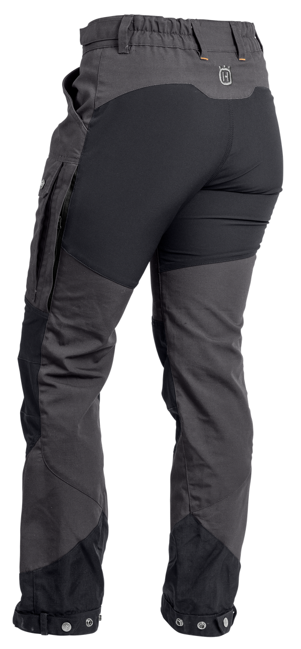 Comfortable and durable women’s trousers for outdoor activity. The highly flexible 4-way stretch fabric on knees and rear offers great movability. The waist is adjustable to your fit with a hook and loop strap and the length of the legs can be adjusted with buttons. Your mobile phone is protected by a padded pocket while you find your way through the rugged terrain. Available in size XS to L and regular leg and short leg models. Colour: Charcoal black/Anthracite grey.